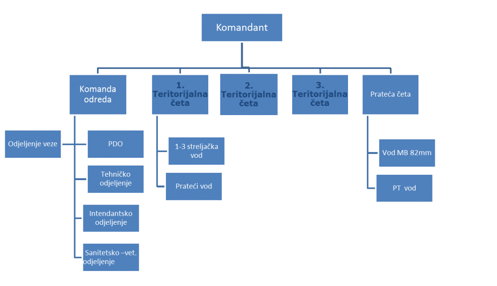 Organizaciono-formacijska struktura odreda jebila po formaciji TO tip II četnog sastava: 3 pješadijske čete TO sa pratećom četom sastava voda MB82mm i PO vodom BsT 82mm, komandom odreda, prištabskim odjeljenjima: veze, izviđačko i kurirsko odjeljenje i pozadinski vod, sa adekvatnom VES i starosnom strukturom popune.