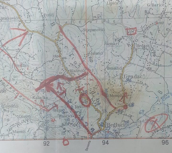 karta Derventa ← Prethodno Sledeće → Napad Vukova na Bijelo brdo iz pravca Kalačka i Raščiči i drugi pravac iz Begluka